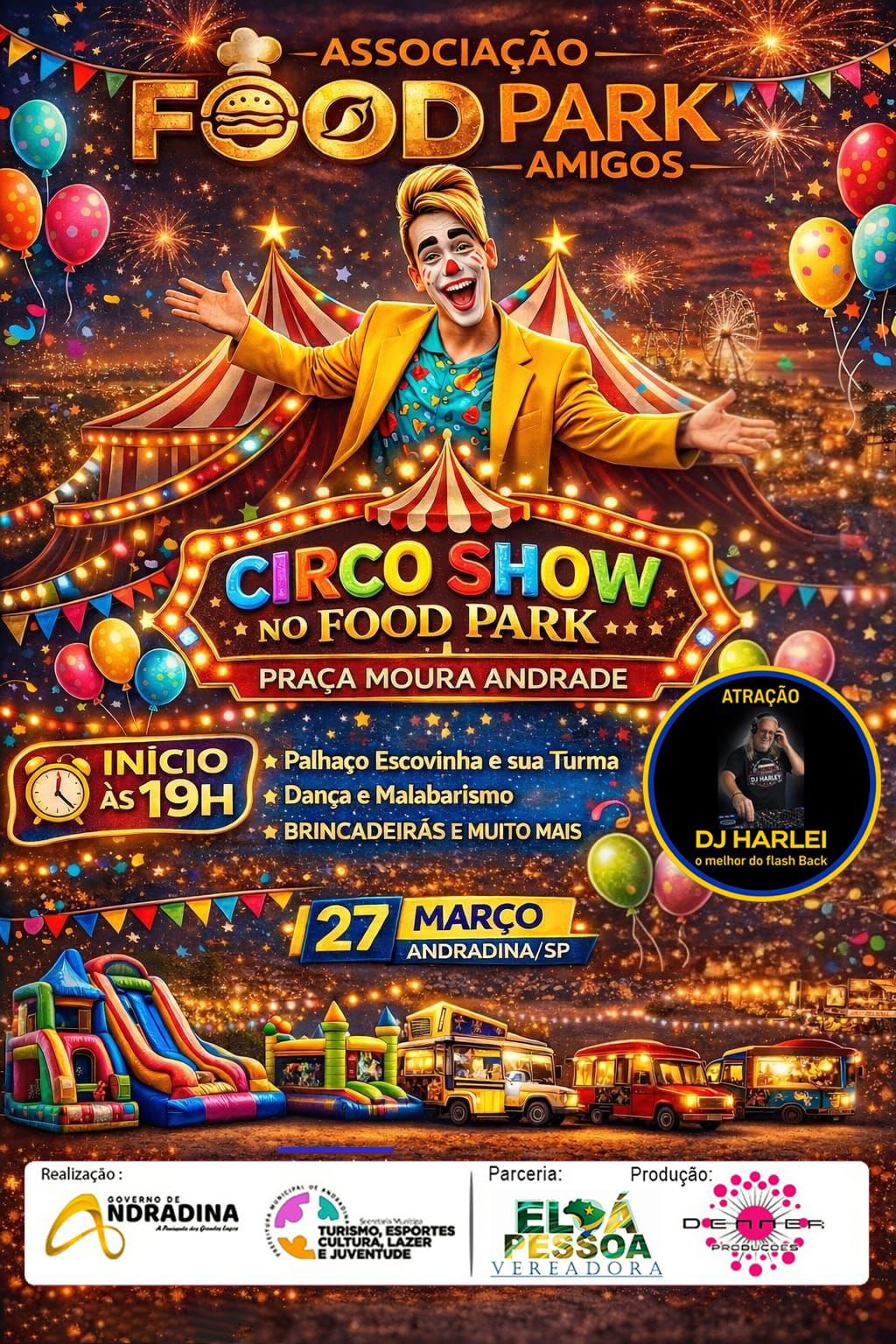 Na sexta-feira, 27, o Food Park Amigos, traz duas atrações, um show circense com o palhaço Escovinha, num evento dedicado à família, com o apoio da Vereadora Eloá Pessoa. A segunda atração é o Dj Harley Cabral tocando os melhores flashbacks dos anos 70, 80 e 90.