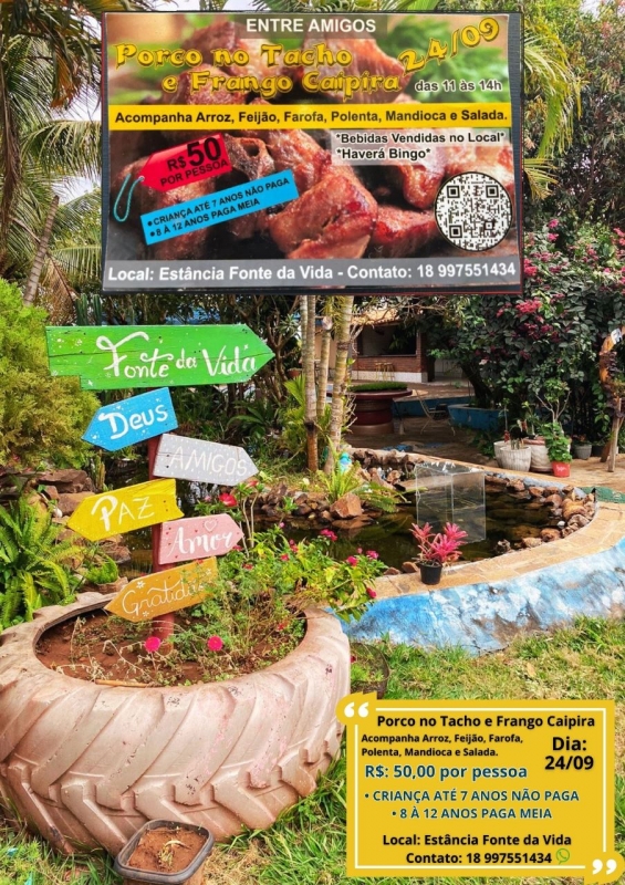 Para resgatar essas origens, o primeiro evento acontece em 24 de setembro na Estância Fonte de Vida, no Assentamento Arizona. Os anfitriões prepararam um cardápio genuíno, com porco no tacho e frango caipira, acompanhado de polenta, arroz, feijão, mandioca, farofa e salada. E já pensou em um doce caipira de sobremesa?