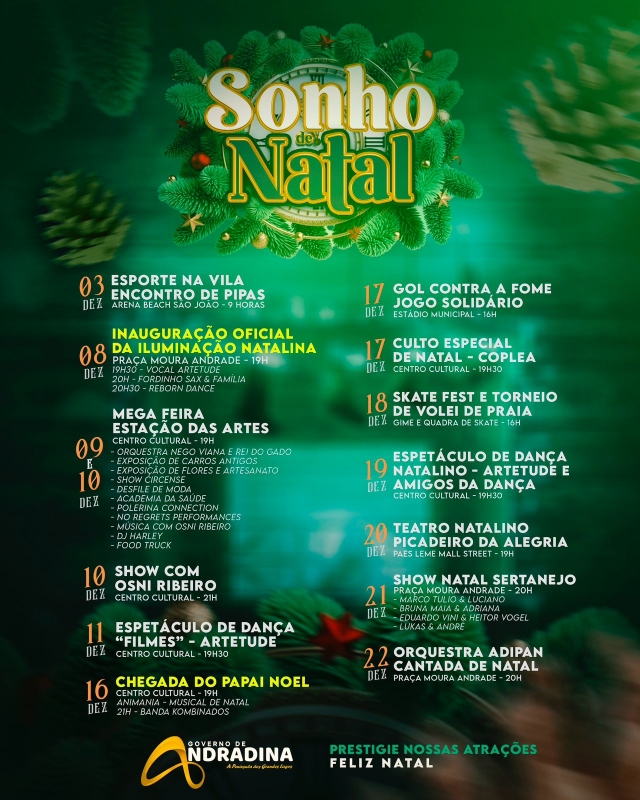 E no dia 22, a Praça Moura Andrade volta a ser palco de apresentações desta vez com uma Cantata de Natal pela Orquestra Adipan, à partir das 20h.