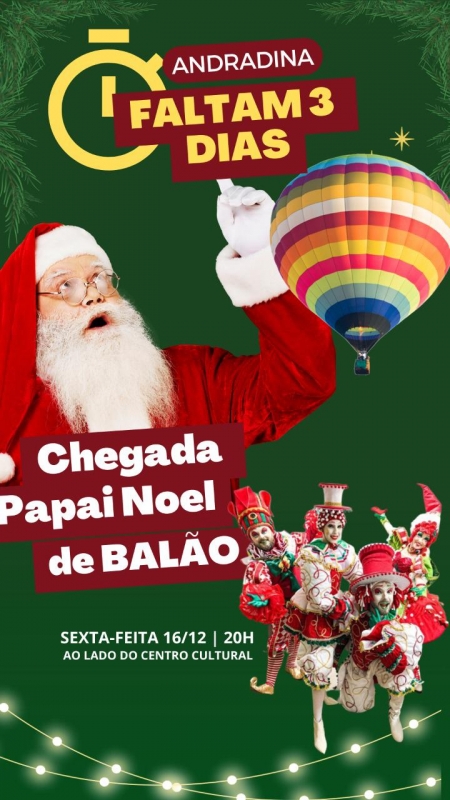Vindo dos céus de Andradina é que o Papai Noel chegará em 2022. O evento programado para o próximo dia 16 às 19h no Centro Cultural promete reunir milhares de pessoas. Além da esperada presença do ícone do Natal ainda haverá Animania com um musical de Natal e a apresentação da Banda Kombinados,